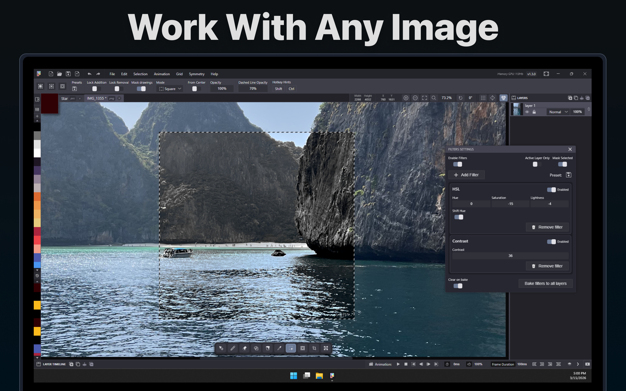 - Transform: Scale, rotate, and move pixels or selections with precise controls.