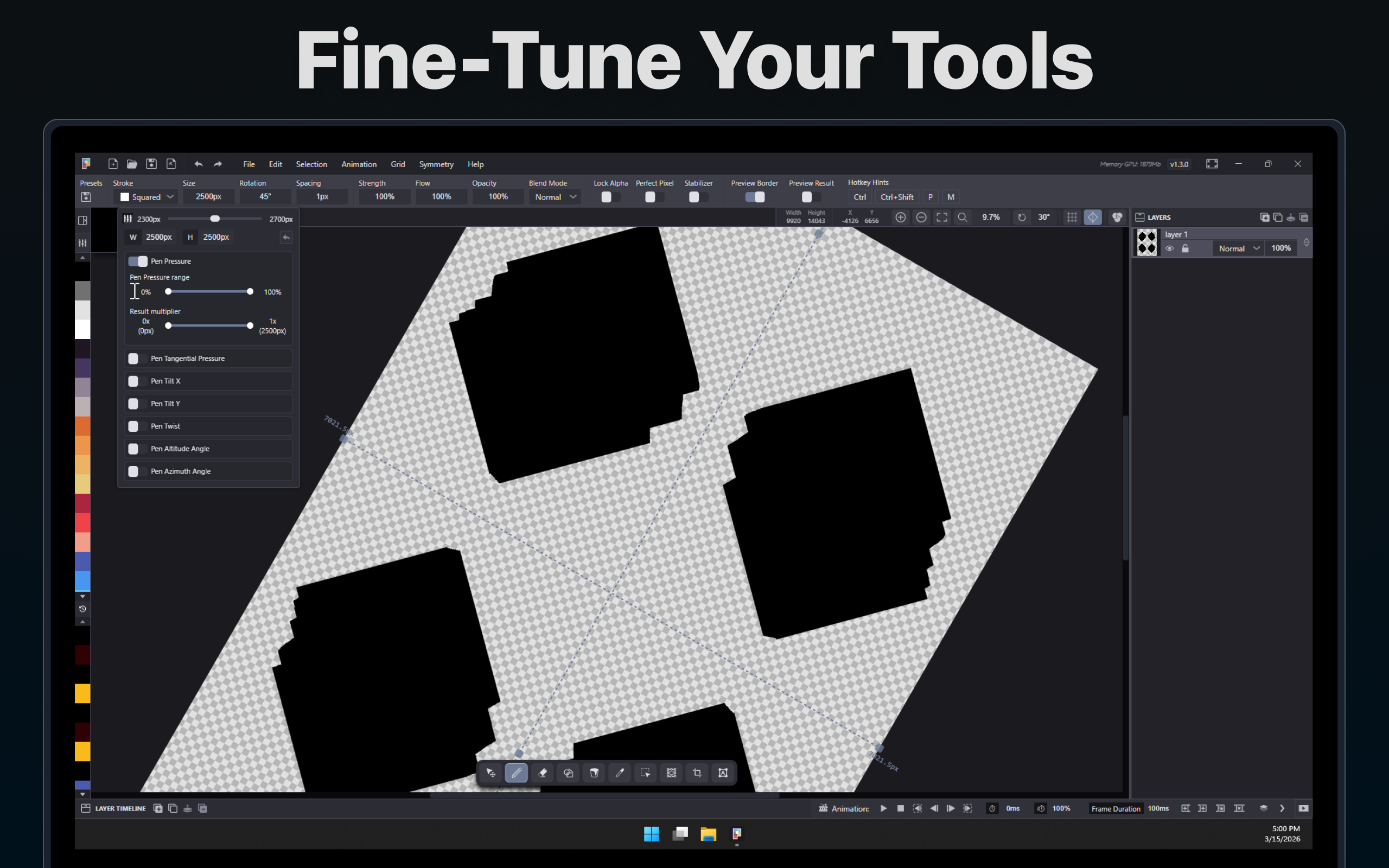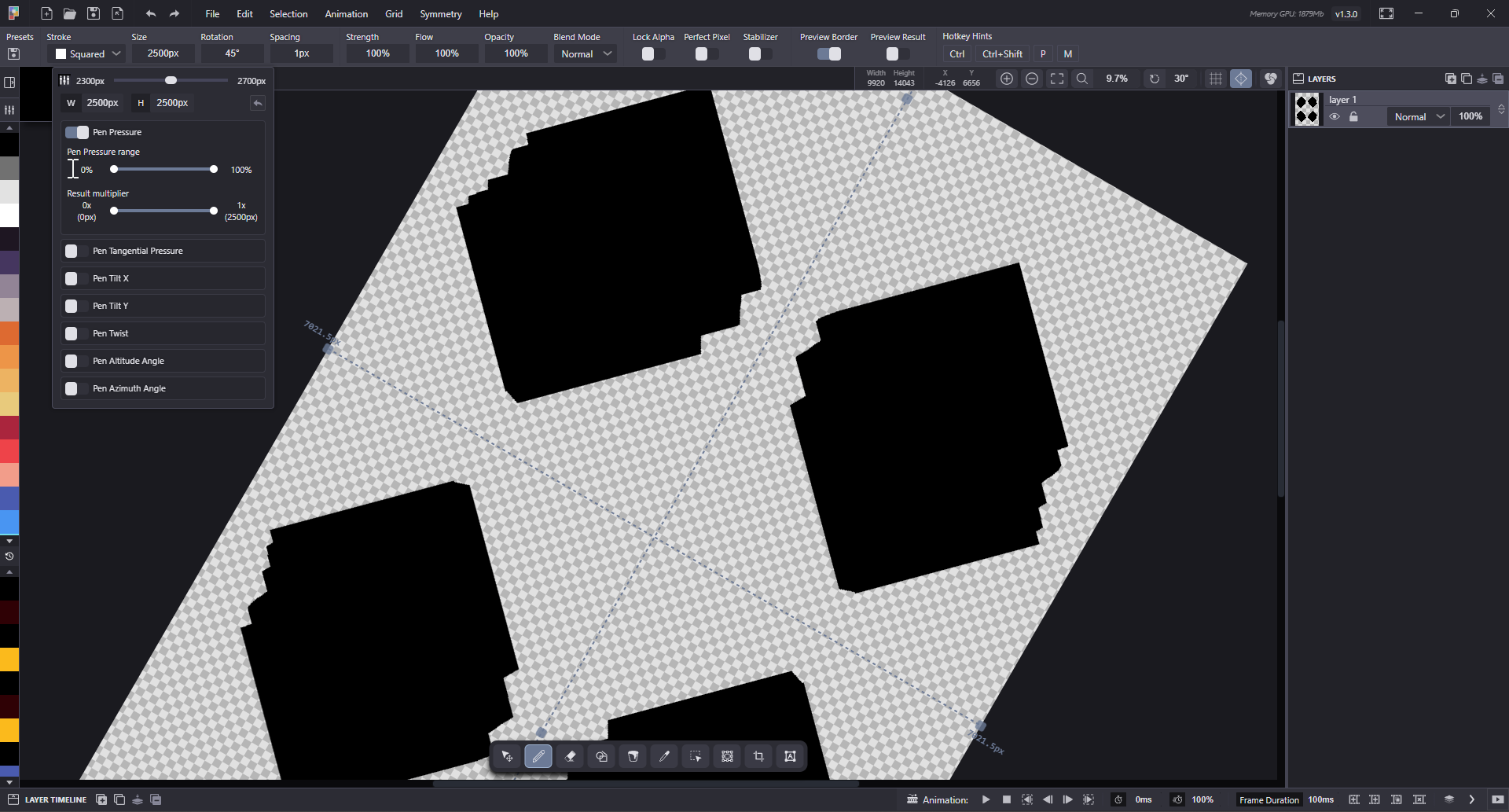 Pixsplat offers several pixel drawing tools optimized for precision and control over every stroke, with full support for pen tablets. Configure the following attributes to respond to pressure and other pen tablet inputs: