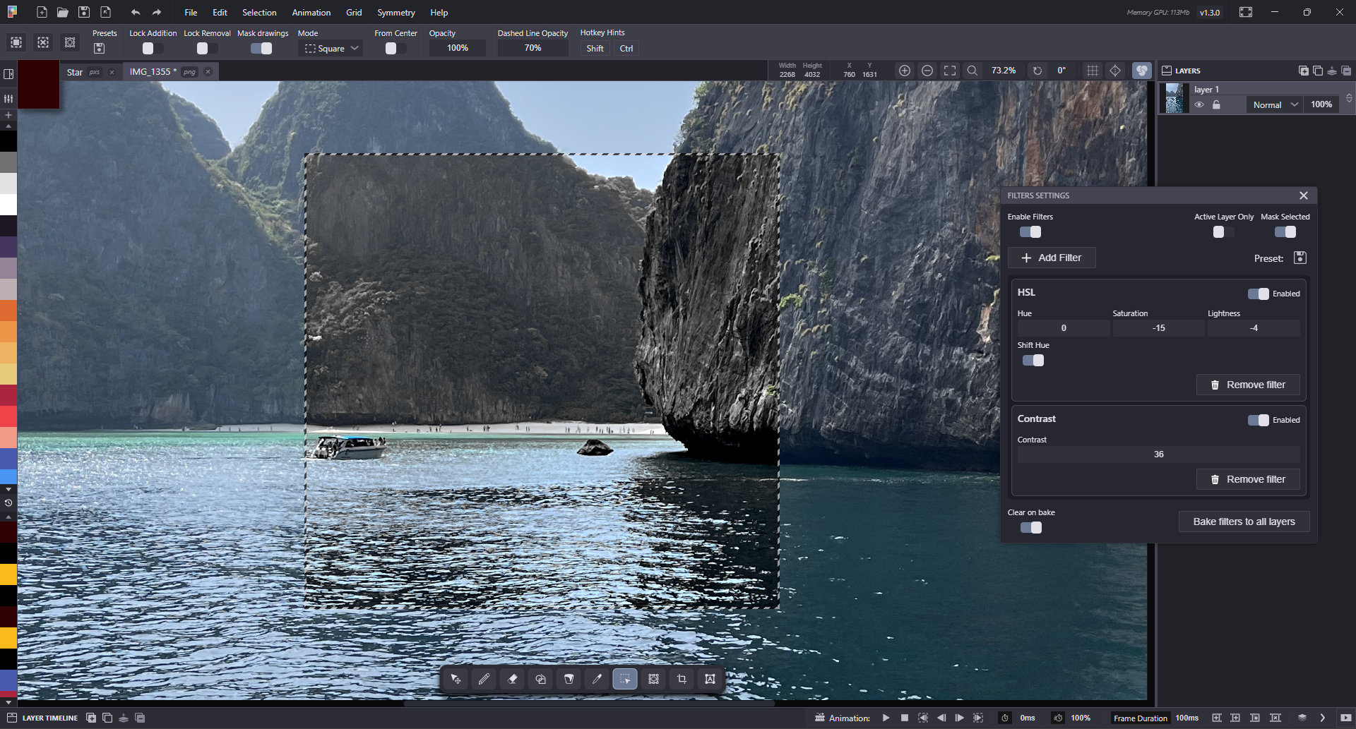 - Mask Selected Area: Use the “Mask Selected” switch to apply filters to a specific area. Select a region with the selection tool, adjust the outline’s opacity for clarity, and preview the effect within just that area.